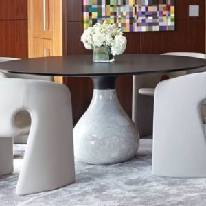 This dining table showcases the elegance of Italian Calacatta green and white marble, with its bold, contrasting veining. The sophisticated design elevates any dining space with timeless luxury and refined beauty.